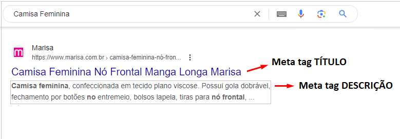 Exemplo de como as meta tags são exibidas na página de buscas do Google: