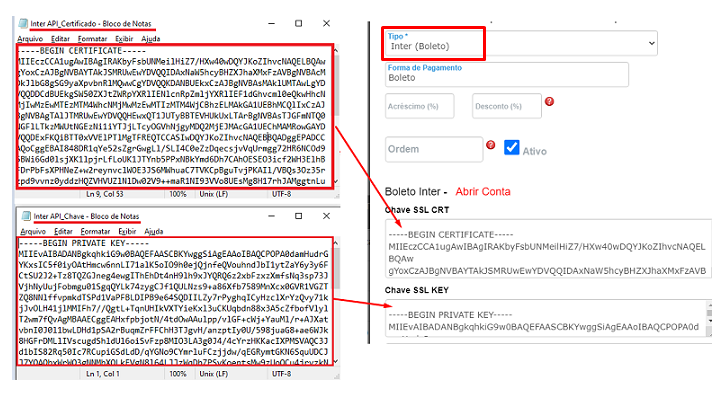 Agora insira a chave do certificado e chave key que obteve no passo 8, conforme ilustrado abaixo: